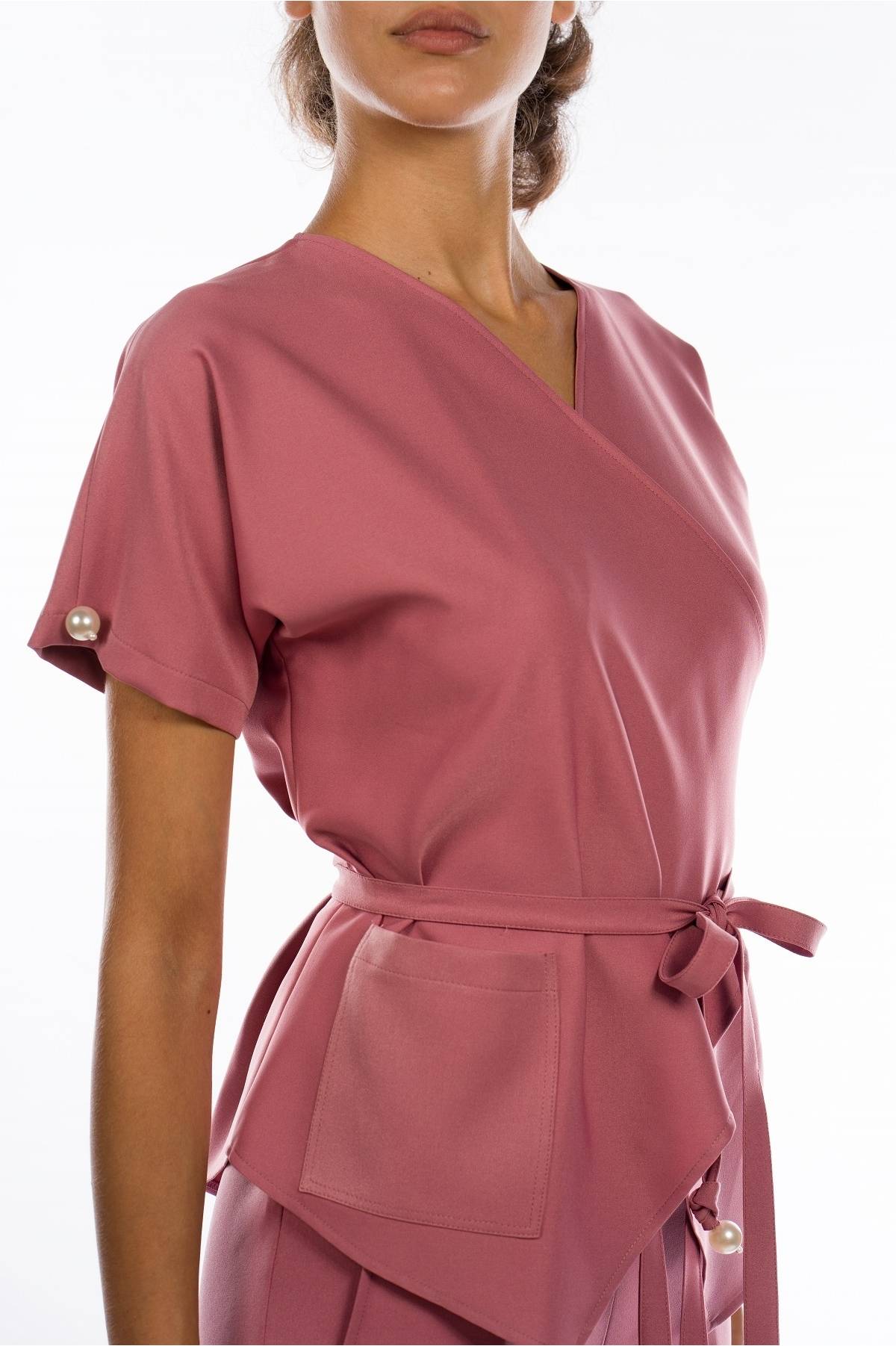 Bluza medicala petrecuta roz , croiala tip chimono, cordon in talie, un buzunar aplicat, accesorizata cu perle.